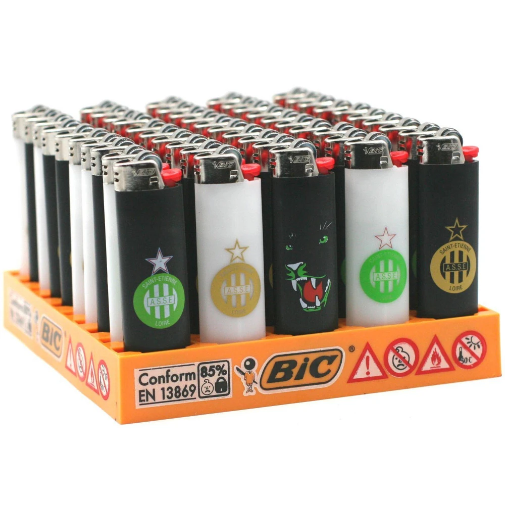 Plaquette complète avec 50 briquets BIC J26 (grand format) supporter de l’équipe de l’ASSE. Avec 5 modèles différents comprenant des motifs dans les tons vert, blanc, noir et doré. Parfait pour les fans des Verts !
